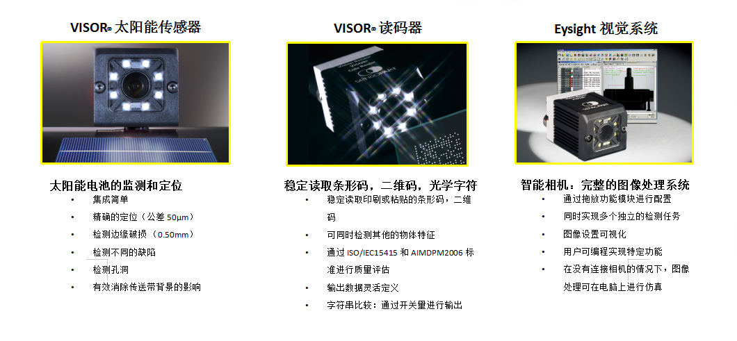 VISOR? 安裝,設(shè)置,運行操作簡單直觀,VISOR視覺系統(tǒng)能提供簡單和高效的解決方案。無論是形狀復(fù)雜的物體,二維碼,自身發(fā)光元件,還是有邊緣缺陷的太陽能電池—我們的視覺傳感器都能夠可靠地檢測出物體的相關(guān)特性