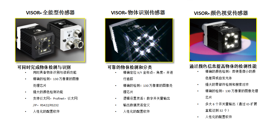 VISOR? 安裝,設置,運行操作簡單直觀,VISOR視覺系統(tǒng)能提供簡單和高效的解決方案。無論是形狀復雜的物體,二維碼,自身發(fā)光元件,還是有邊緣缺陷的太陽能電池—我們的視覺傳感器都能夠可靠地檢測出物體的相關(guān)特性